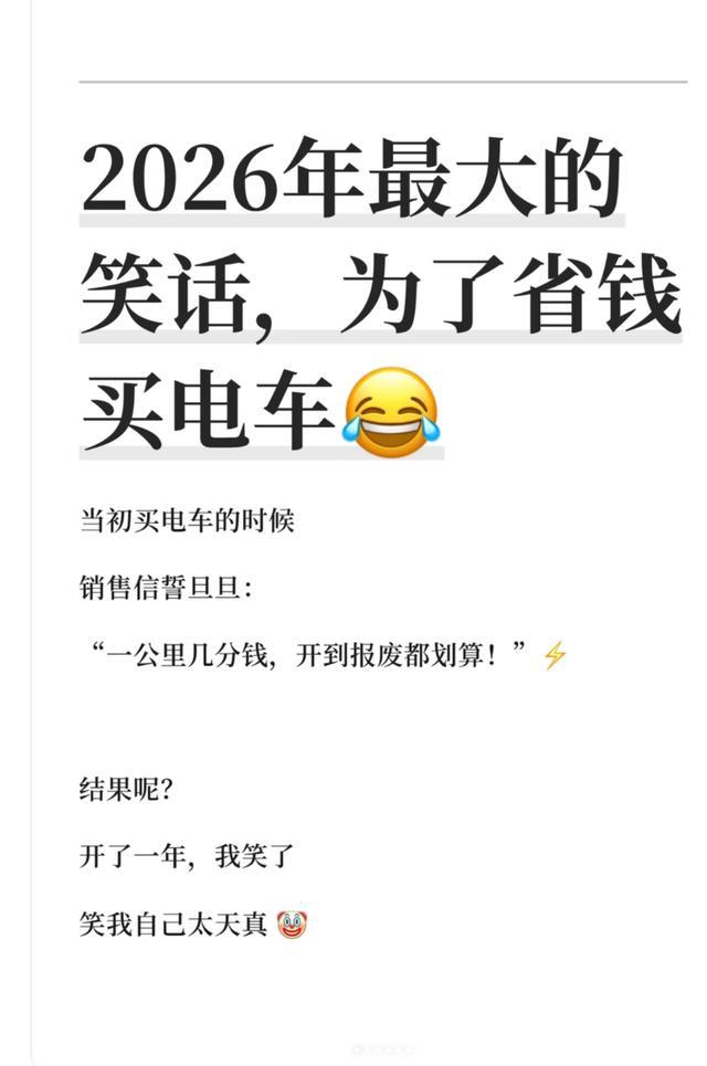 不少人买电车的初衷都是为了省钱,觉得用电比用油便宜太多,日常通勤能省下一大笔开支。可进入 2026 年,越来越多车主发现,当初的想法太过理想化,电车看似省油钱,实际保险、贬值、维修、充电时间等隐形成本远超预期,算总账甚至比油车更贵,“为省钱买电车” 也被不少网友调侃成年度最大笑话。这并非否定电车的价值,而是提醒消费者,买车不能只看表面能耗,必须把全周期成本算清楚,才能避免盲目选择。